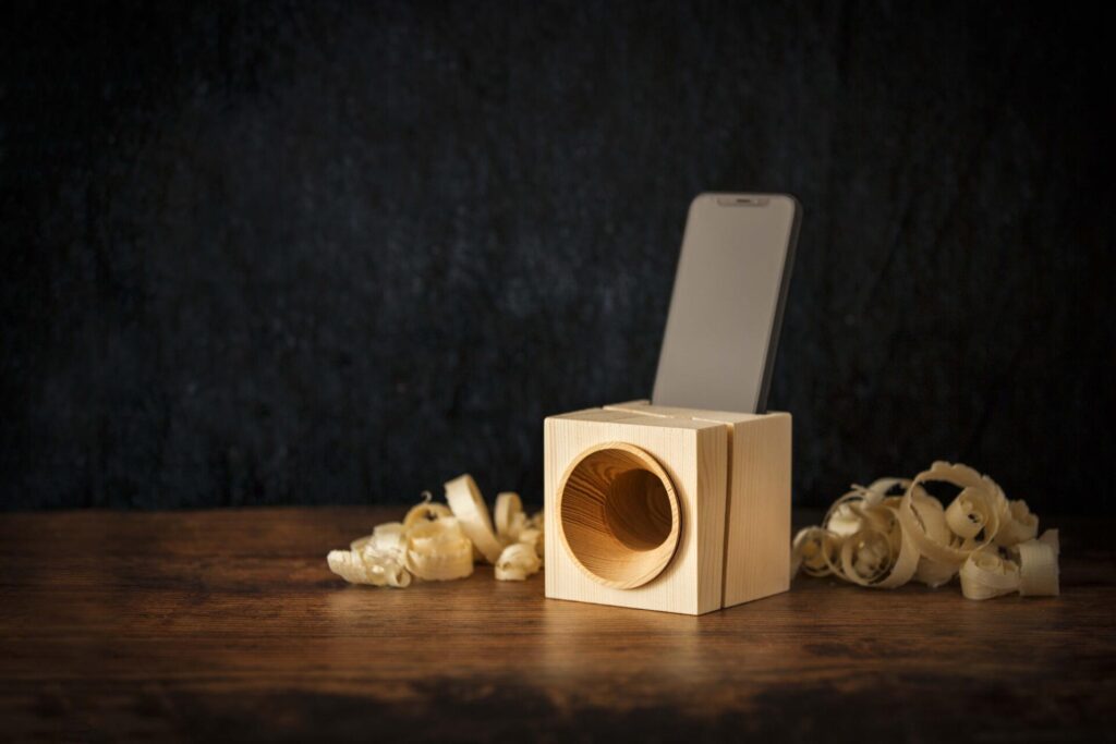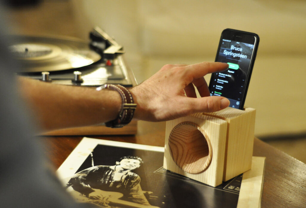 «L’idea è arrivata dalla tempesta, dai 42 milioni di alberi abbattuti e rimasti a terra. Quel legno, lo stesso con cui si costruiscono i migliori violini del mondo, un legno pregiatissimo, era troppo per essere processato dalla nostra filiera. Quindi strutture industriali più strutturate della nostra, principalmente quella austriaca, hanno cominciato a prelevare a zero gli alberi abbattuti, per poi rivendere il legname a venti volte il valore. Un’altra parte veniva chippata, ossia sminuzzata per poi comporre il pellet, materiale da riscaldamento. Ci siamo detti che tutto quel legno andava valorizzato, andando a raccontarne la storia e rispettandone passato e futuro. È nato così il progetto di un cubo amplificatore per smartphone, tu ci metti il tuo telefono dentro con la musica accesa e il cubo la amplifica come se fosse una cassa passiva. Del resto, il legno di quei larici avrebbe dovuto servire comunque la musica andando a creare i più bei violini che possiamo costruire, così in qualche modo verrà impiegato per lo stesso scopo. Inoltre, la metafora che mi piace sempre richiamare, quest’oggetto amplifica anche il messaggio che vogliamo mandare, ossia di rinascita e valorizzazione delle ricchezze di un territorio, il nostro, che non sono solo gli alberi, ma anche le persone che lavorano nella filiera che li rende utilizzabili per i nostri scopi.»