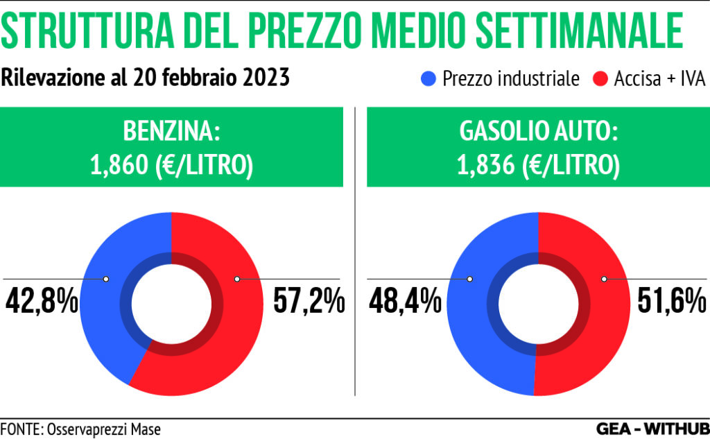 Intanto la questione dei prezzi resta complicata. Quello del gasolio rimane sotto quello della benzina: «In ogni caso rispetto a un anno fa, ossia all’ultimo prezzo prima dello scoppio della guerra in Ucraina, un litro di benzina costa ora lo 0,5% in più, pari a 1 euro per un pieno da 50 litri, mentre il gasolio è maggiore di oltre 11 centesimi al litro, con un balzo del 6,6%, pari a 5 euro e 71 cent a rifornimento», spiega Massimiliano Dona, presidente dell’Unione Nazionale Consumatori. Secondo Dona il governo ha responsabilità in relazione alle accise sul carburante: «Rispetto all’inizio dell’anno, per colpa dell’aumento delle accise di 15 centesimi deciso dal Governo, un litro di benzina è più caro di quasi 22 centesimi, un salto del 13,1%, equivalente a 10 euro e 80 centesimi per un pieno, con una stangata su base annua pari a 259 euro per una famiglia che fa due pieni al mese, il gasolio è salito di quasi 13 centesimi al litro, +7,5%, pari a 6 euro e 44 centesimi a rifornimento, una mazzata da 154 euro all’anno», conclude Dona.