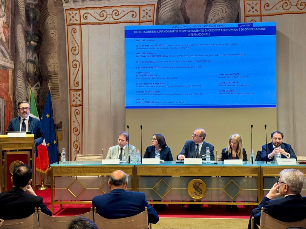 La Sala Zuccari di Palazzo Giustiniani ha ospitato, su iniziativa del senatore Andrea De Priamo (FdI), il convegno “Oltre i confini: il Piano Mattei come strumento di crescita economica e di cooperazione internazionale”. Attorno al tavolo si sono riuniti i principali protagonisti del mondo istituzionale, industriale e finanziario per fare il punto sulle strategie di sviluppo e sulle opportunità di crescita condivisa tra l’Italia e il continente africano.