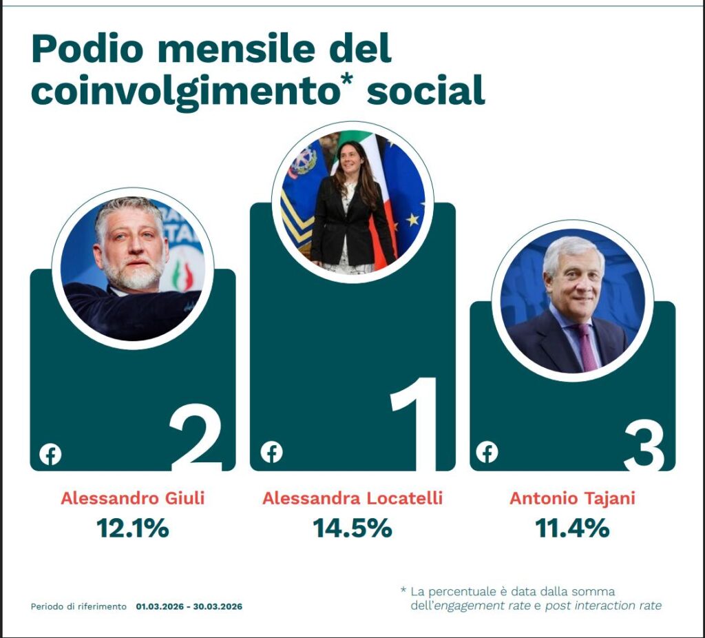Su Facebook Locatelli si conferma in testa all’engagement con il 12%, davanti a Tajani (7%) e Piantedosi (5,8%). Per i nuovi follower in valore assoluto sulla piattaforma Meta è invece Tajani a guidare con +8.248, seguito da Salvini (+5.155) e Piantedosi (+4.871). Quanto alla crescita percentuale, Alessandro Giuli mantiene il primato con +14%, un dato che si ripete con costanza nei mesi e che segnala una base di follower ancora relativamente contenuta ma in espansione rapida.