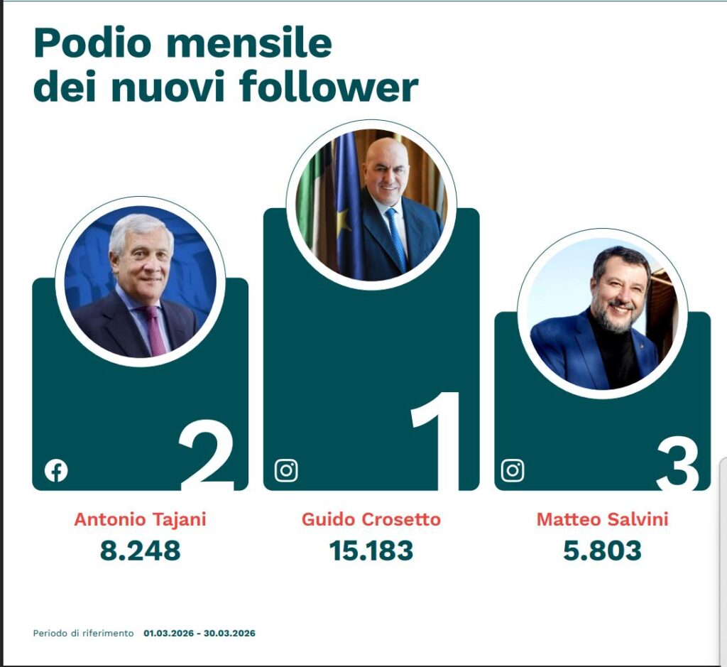 Il dato più sorprendente del mese riguarda però Guido Crosetto, che ha segnato un vero cambio di passo nella sua presenza digitale. Il ministro della Difesa ha guidato la classifica dei nuovi follower con +15.183 iscritti su Instagram – quasi il doppio di Tajani, secondo con 8.248 – e ha pubblicato 201 post su X, più di qualsiasi altro collega di governo. Su Facebook ha registrato la migliore post interaction del mese (7,9%) e una crescita percentuale dei follower del 3,1%.