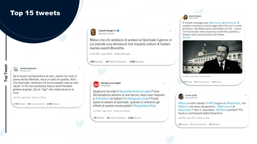 Nella settimana dal 3 al 10 gennaio, non a caso, sono stati ben 14.187 i tweet totali riguardanti l’hashtag “Quirinale”, con un coinvolgimento complessivo di 7.016 utenti. Le pubblicazioni si sono concentrate nei giorni del 4 e del 5 gennaio, quando è stato comunicato l’inizio delle votazioni dal 24 gennaio e la partita è entrata ufficialmente “nel vivo”. Da quel momento è continuato il toto nomi, con i sempre più frequenti ingressi, nei tweet, del nome di Silvio Berlusconi, il grande outsider della sfida.