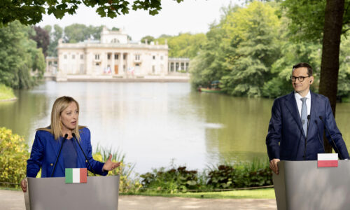 Giorgia Meloni a Varsavia per il bilaterale con il presidente polacco Mateusz Morawiecki. Sullo sfondo le prossime elezioni europee.
